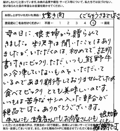 母の日に娘夫婦から贈られてきました。米沢牛は聞いたことはありましたが、いただくのは初めてで証明書付きにビックリ。ただいつも熊野牛の冷凍していないものをいただいているのであまり期待しておりませんでしたが、食べてビックリ。とても美味しいのです。いつもは苦手なサシの入った部分が絶品でした。ありがとうございます。牛さんにも生産者さんにもお肉屋さんにも娘夫婦にも感謝です。